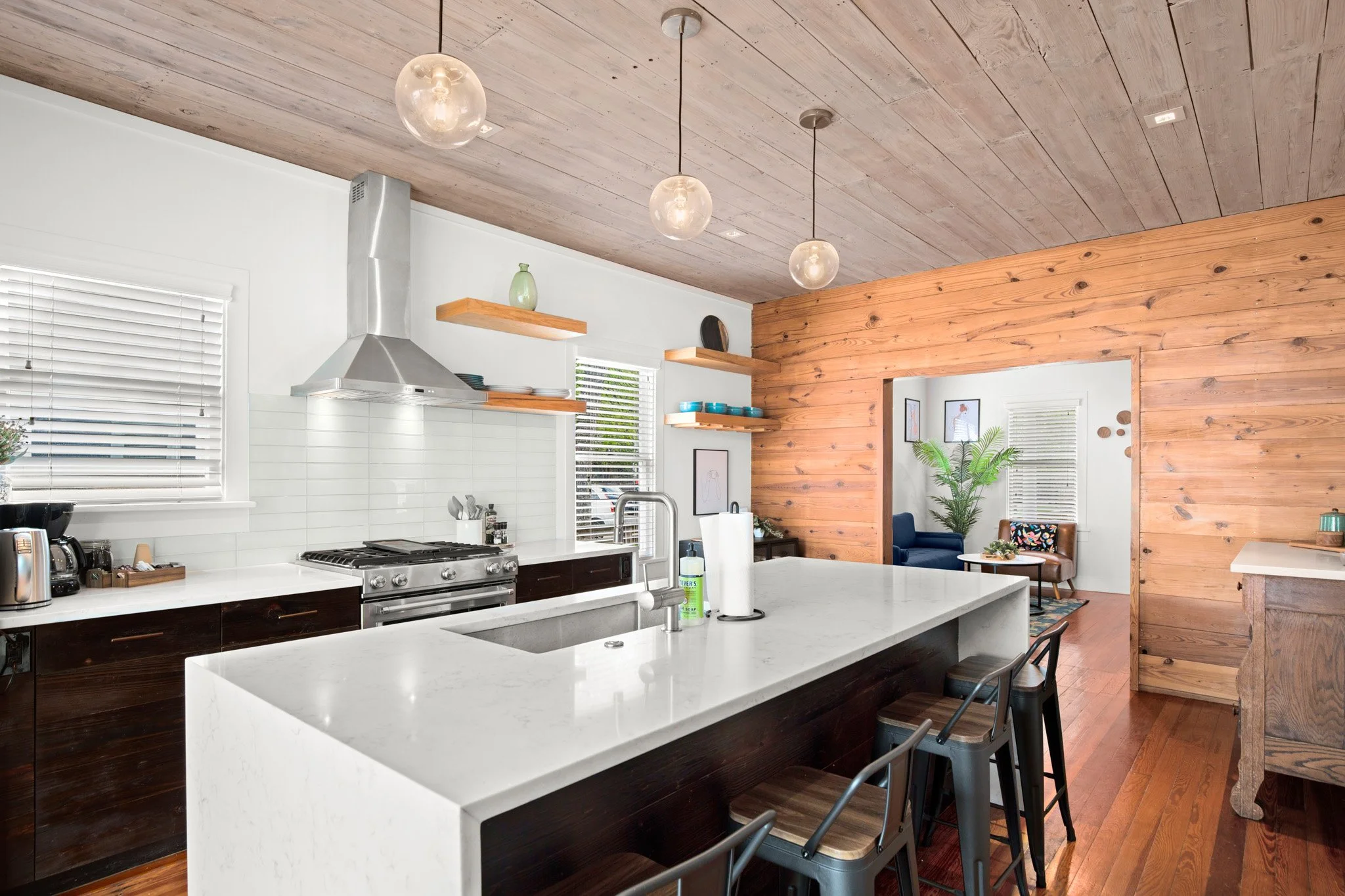 The remodeling process revealed hidden treasures, including pristine shiplap that graced the interior walls. With a commitment to preservation and sustainability, the shiplap was repurposed throughout the home, breathing new life into its storied past. The cabinets, crafted from shou sugi ban, pay homage to the original ship lap, adding a touch of rustic elegance to the space.