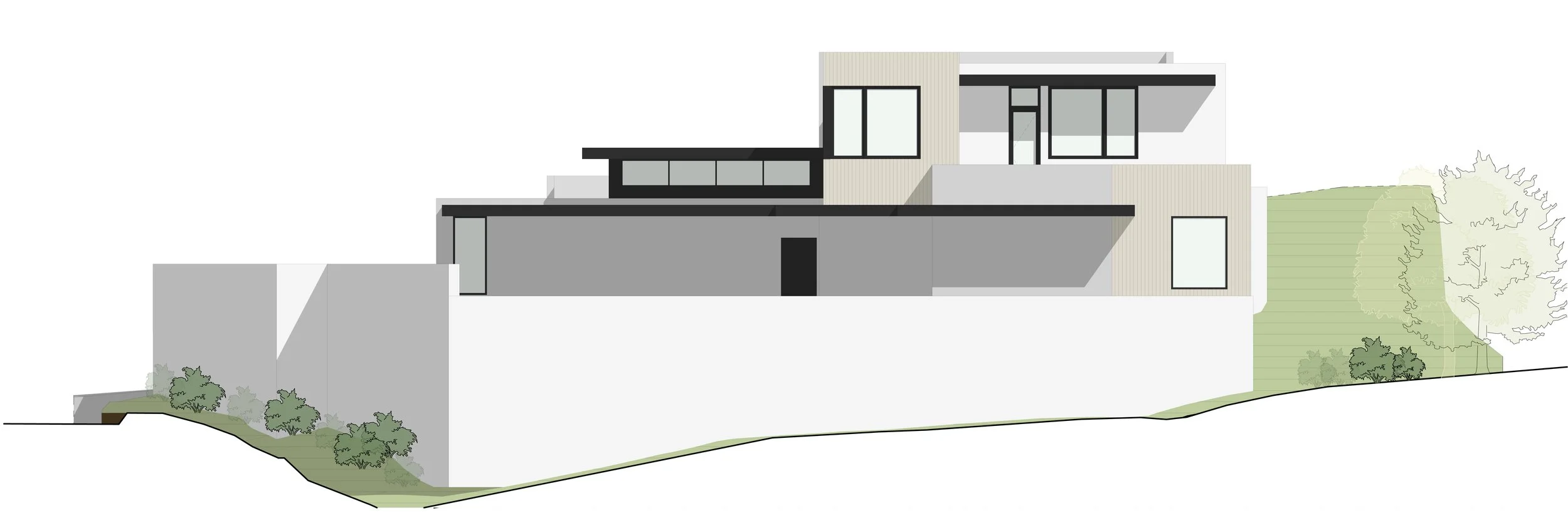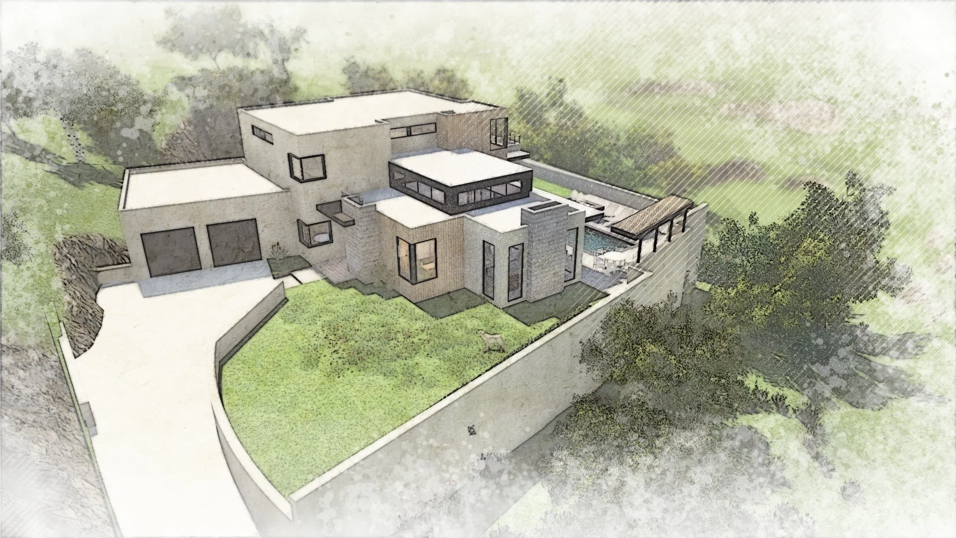 Approaching the home, visitors are greeted by a welcoming courtyard that effortlessly integrates with the environment. The entry and pool area serve as focal points, highlighting the seamless transition between indoor and outdoor spaces.